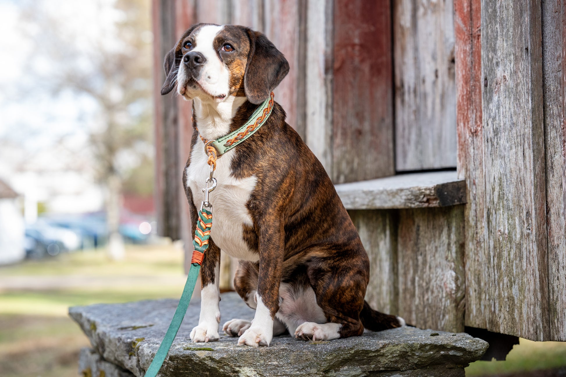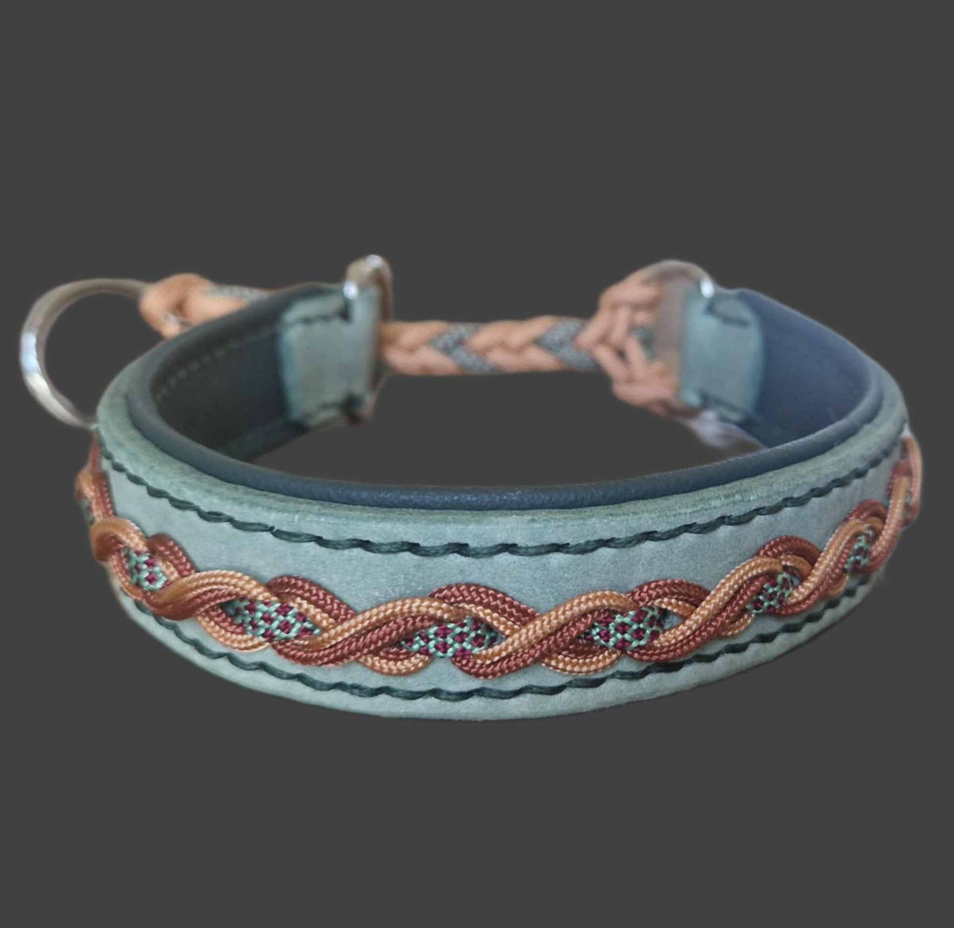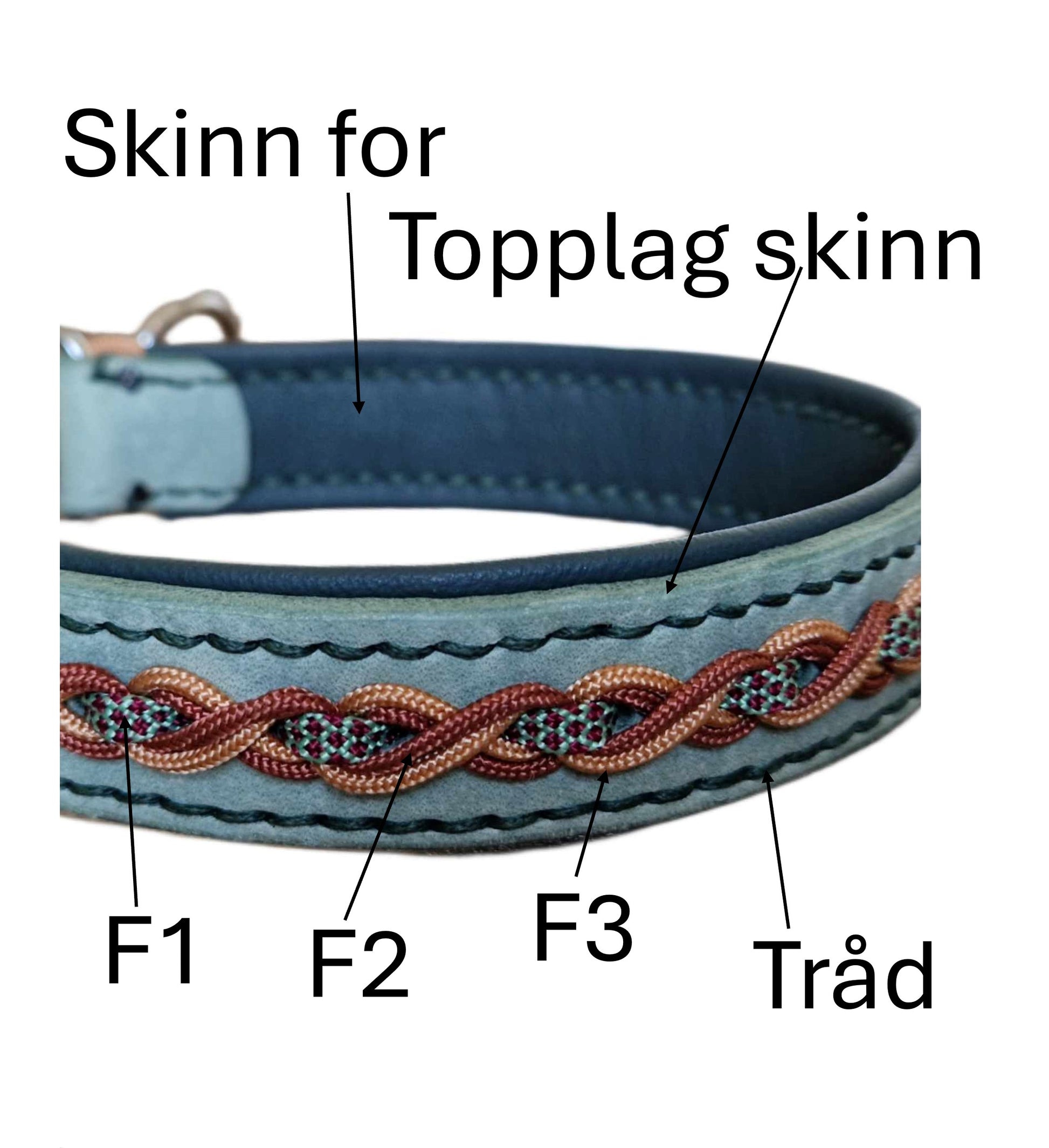 Dette er eit skinnhalsband, som er laga av to lag skinn. Eit tynt mjukt skinn som blir brukt som foring inn mot halsen til hunden, og eit tjukkare lær på toppen. Foret stikker litt utanfor det øverste lær laget slik at begge fargane er synlege.