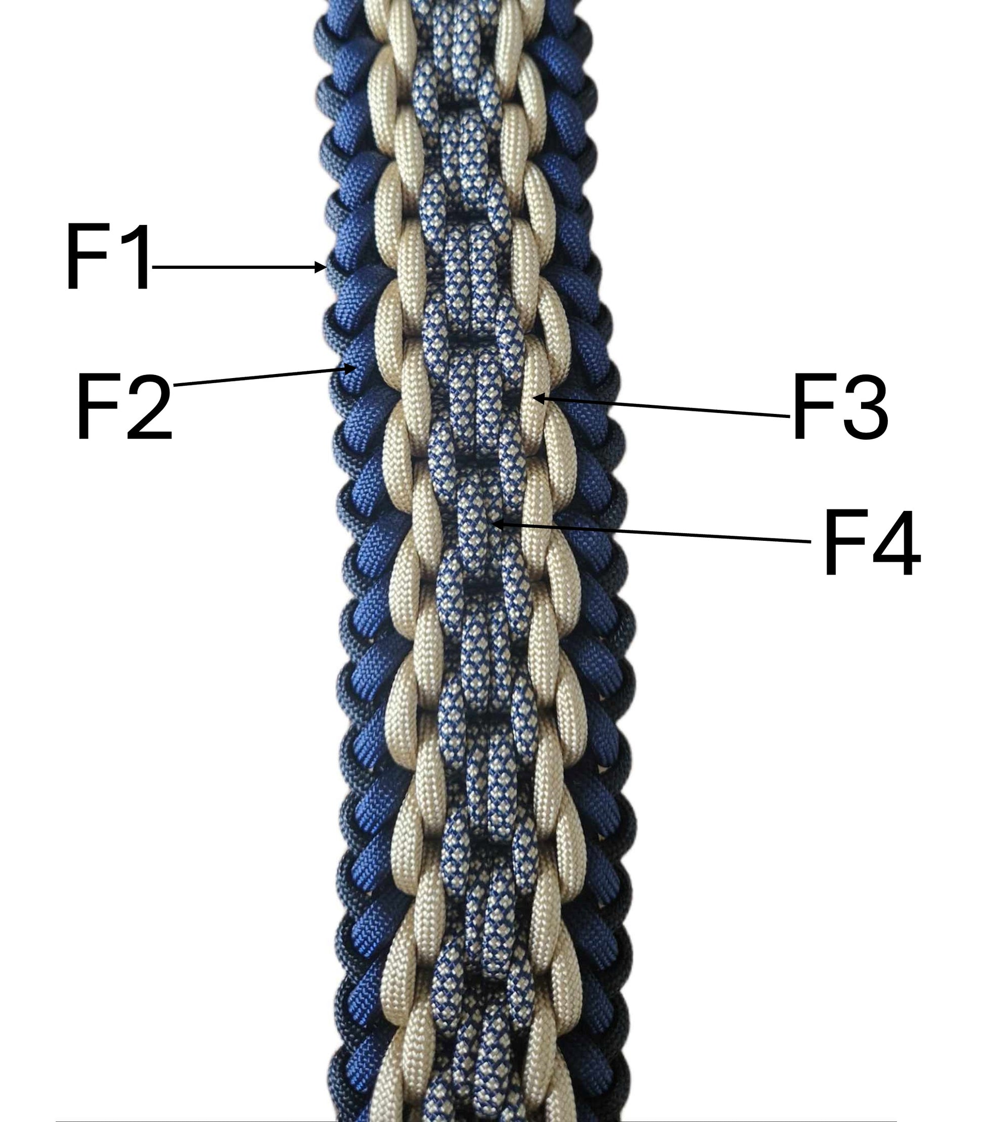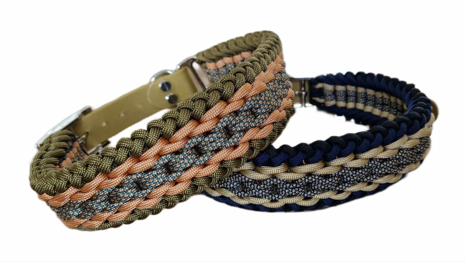 Dette er eit halsband fletta i paracord. Det har eit togskinnemønster som gir halsbandet ein fin bredde.