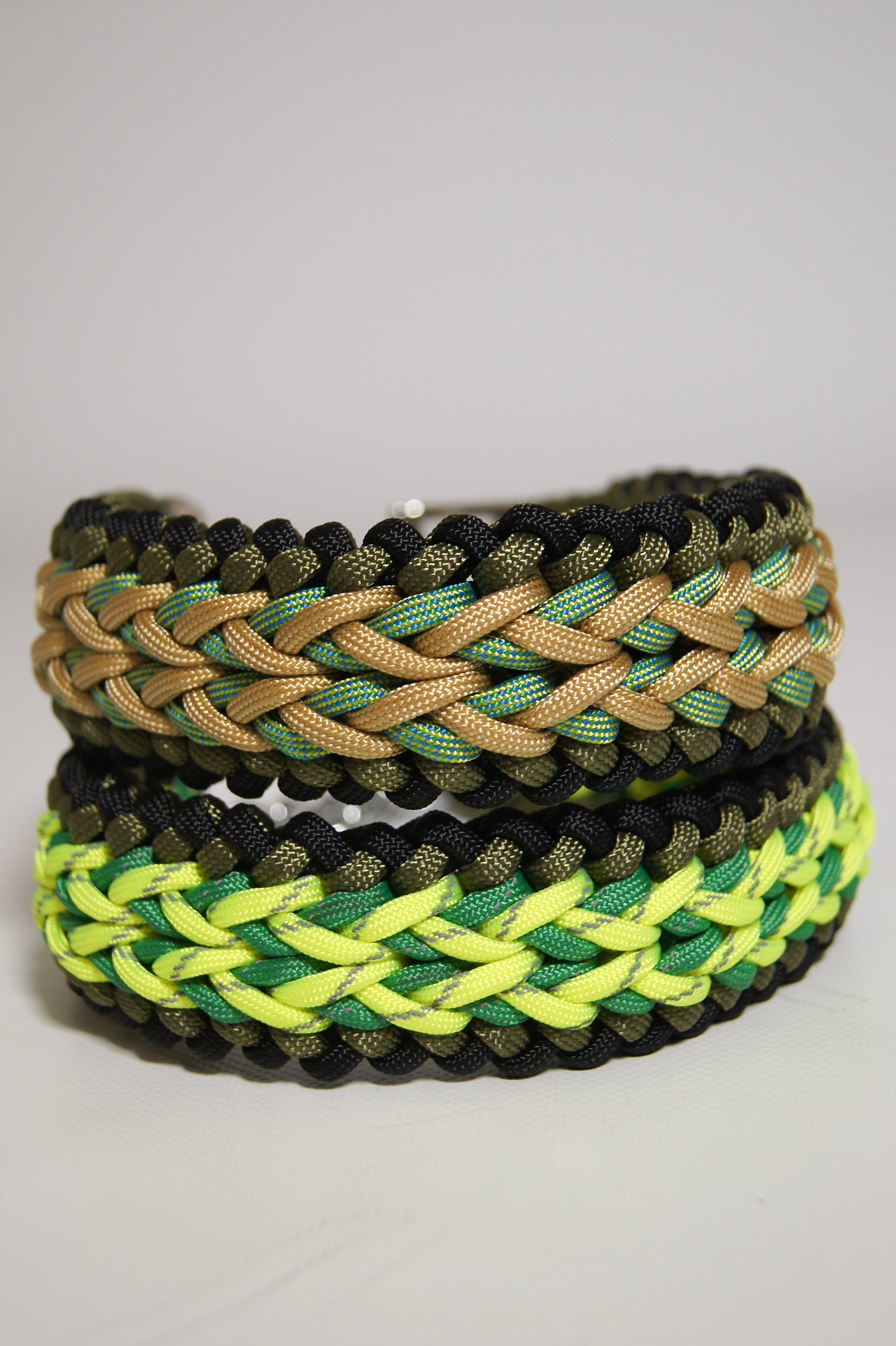 Mål kan variere litt utifrå om ein flettar veldig stramt eller litt lausare, om ein fletter stramt blir halsbandet hardare, smalare og tjukkare, medan om ein flettar lausare blir det breiare, litt mjukare og tynnare. Dersom du har eit spesifikt ønske, gjerne skriv det i kommentarfeltet.