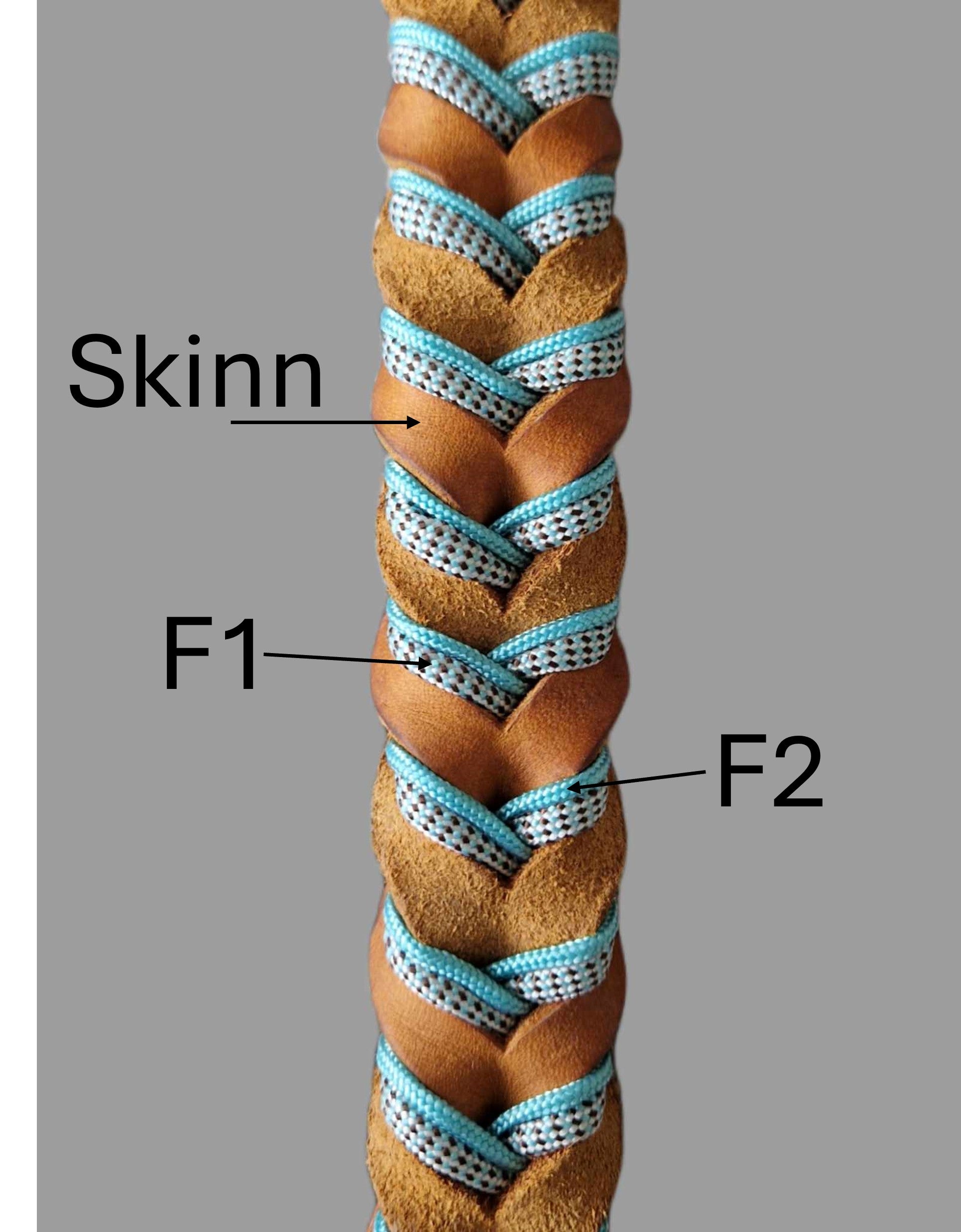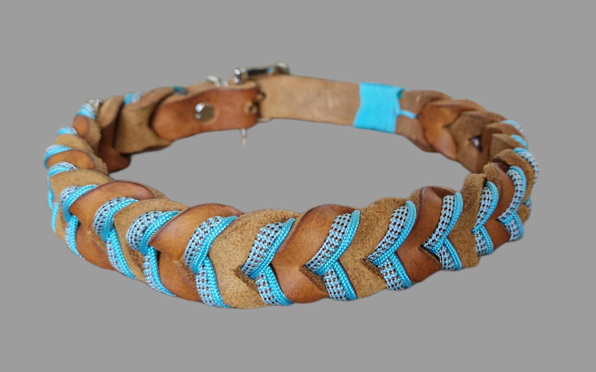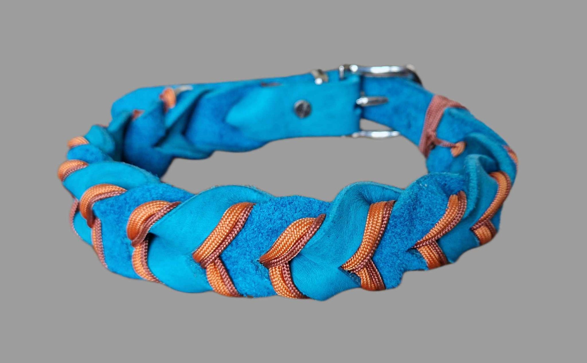 Dette er eit skinnhalsband som er fletta i eit mønster som heiter "bleed knot". Dette betyr at læret er fletta i kvarandre, slik at topplaget og undersida av skinnet vises om kvarandre. Det blir deretter fletta to paracordtrådar i fletta.